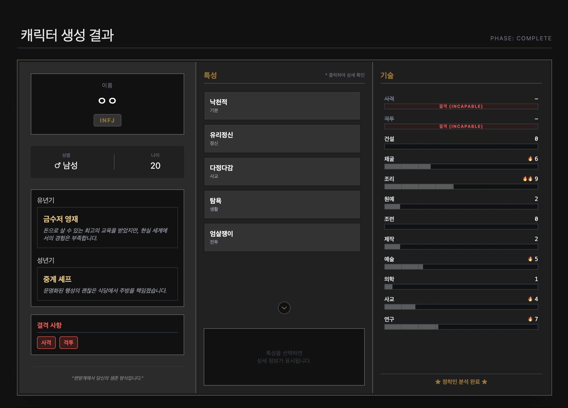 색상도 싹 정리했습니다. 중구난방이던 회색 톤을 통일하고, 림월드의 핵심 포인트 컬러(오렌지 브라운 계열)를 중요 정보에 배치하니 한결 보기 편해졌습니다. 이름, 성별, 나이, 배경 이야기, 결격사항, 특성, 기술이 깔끔하게 나열되는데, 실제 림월드 캐릭터 생성창과 톤이 꽤 비슷하게 뽑혔어요. 반응형 레이아웃도 손봤습니다. 모바일에서도 테스트가 쾌적하도록 버튼 크기와 여백을 꼼꼼하게 재조정했죠. PC로 하든 휴대폰으로 하든 똑같이 림월드 감성을 느낄 수 있게 만들고 싶었거든요.